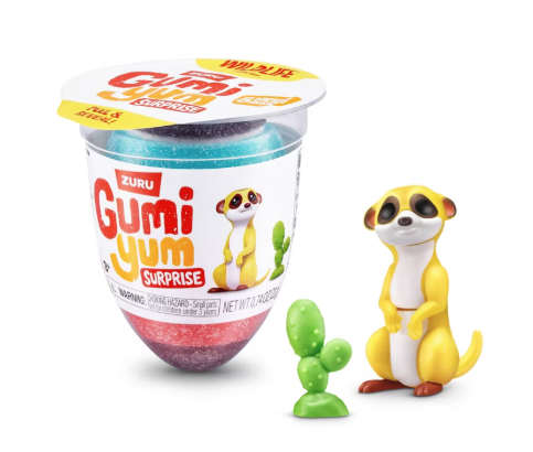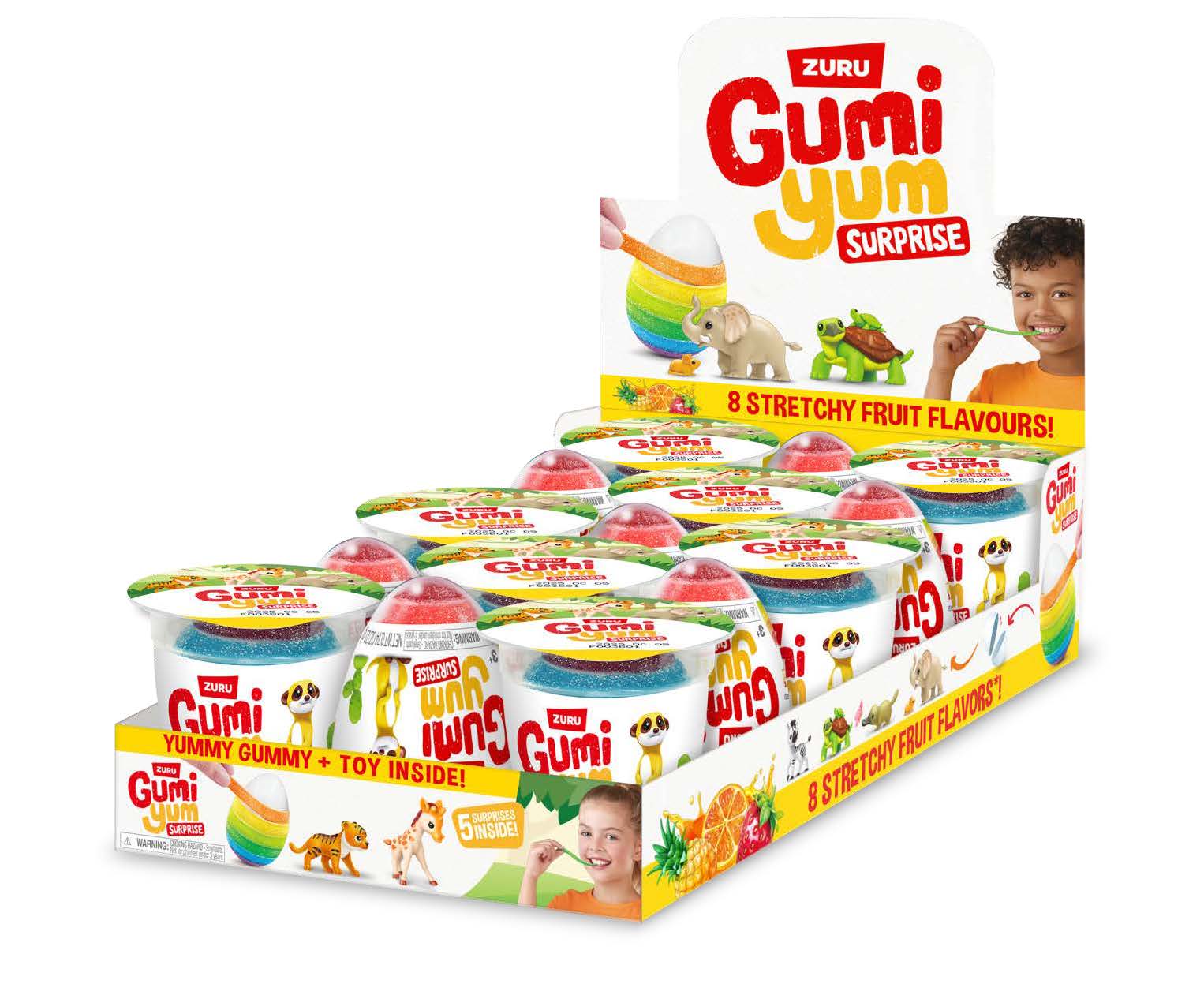 Gumi Yum Surprise Wildlife comes in a display case containing 15 individual cups of stretchy gummy candy. Each cup features colorful fruit-flavored gummy candy plus a collectible wildlife toy surprise hidden inside.