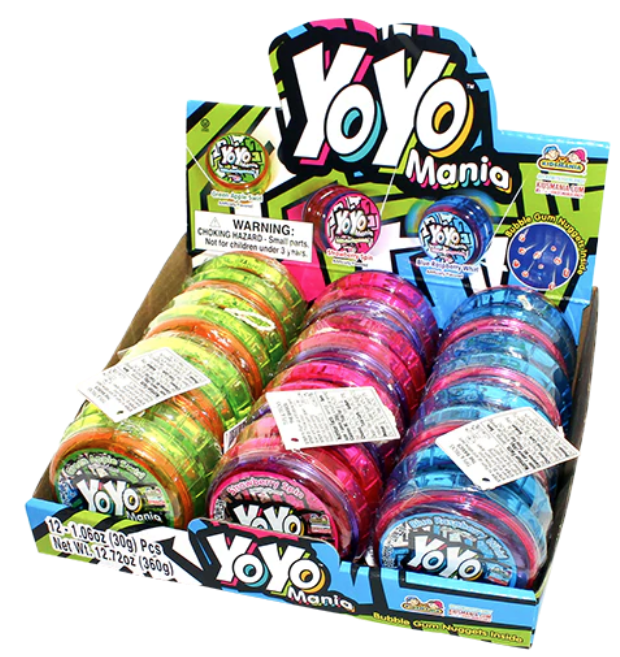 “Here’s a sweet spin on the well-loved yo-yo. 3 different color varieties of yo-yos, each filled with tasty bubble gum nuggets.”