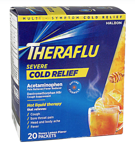 Theraflu Severe Cold & Cough Daytime Dispenser provides temporary relief from cold symptoms like aches, sore throat, congestion, and cough, while also reducing fever.